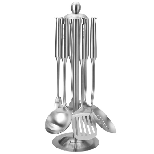 Seven essential kitchen tools in durable 18/10 stainless steel. Seamless design resists corrosion, heat-safe for any cooking task, and dishwasher friendly. Ergonomic handles reduce fatigue, and the rotating stand keeps everything organized and accessible.