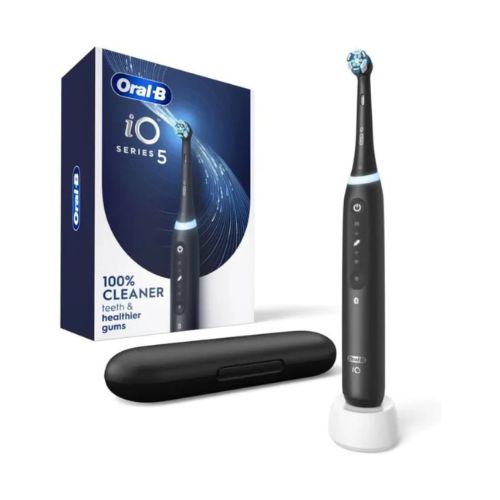 Oral-B iO Series 5 Rechargeable Electric Toothbrush with Visible Pressure Sensor to Protect Gums, 2 Minute Timer, 5 Cleaning Settings, 1 Replacement Toothbrush Heads, and Travel Case, Black